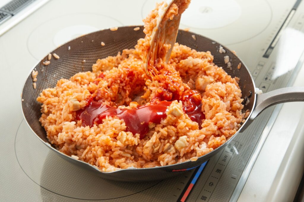 ケチャップは具材やご飯と一緒に混ぜる前に、フライパンで軽く炒めるのが大きなポイントです。